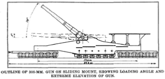 Diagram – French 305 mm gun on a sliding mount, showing how the entire carriage rolls back on rails to absorb recoil. These mounts had no built-in traverse, so track curvature was used for aiming. The gun is shown at loading angle (depressed) and at high elevation.