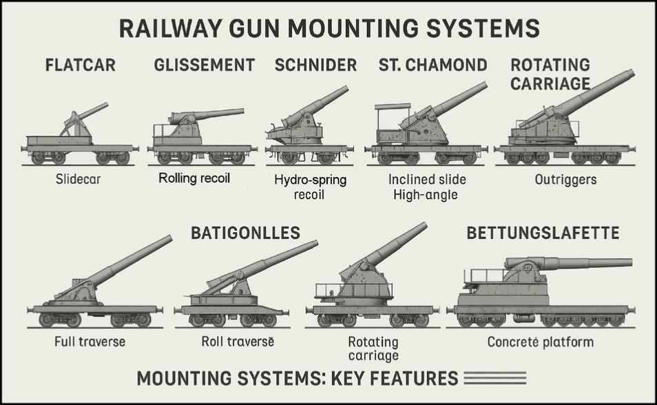 - Visual ID: Schneider-type mounts often featured a long girder-style railcar frame with multiple axles (e.g. two 4-axle bogies), a central recoil cradle with large hydraulic cylinders visible, and sometimes a small gun shield. They lacked the elaborate firing platforms of other types. When in firing position, one may see clamps on the rails or deployed jacks.
