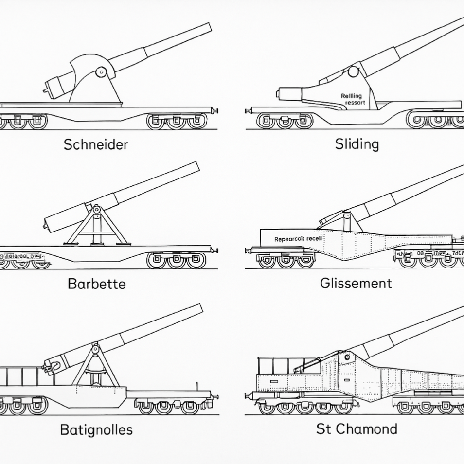 - Visual Identification: As a quick guide – Sliding mounts have no evident recoil cylinders and often an empty space behind for recoil travel. Schneider-type carriages show big recoil pistons and sometimes rail clamps; they look like standard railcars with a gun and perhaps folding supports. Batignolles-type have huge side girders, many wheels, and usually jacking mechanisms – often seen with their car body separated from the trucks in firing position. Chilean/Rotating mounts often have an armored look (partial turrets) and outriggers visible. Barbette mounts appear as very large guns on relatively simple flatcar bases, often with minimal shielding but heavy jacks around.