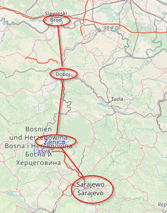 Bosanski Brod–Doboj–Zavidovići–Zenica–Lašva, Podlugovi–Vogošća–Sarajevo; 268.2 km, built 1879–1882, connection to the Spalato Railway at Lašva, as well as the East Bosnian railway and the Narenta railway at Sarajevo.