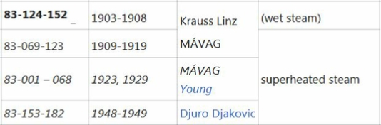 The IVa5 is also regarded as a model for the Mh/Mv (ÖBB 399/299) built by Krauss/Linz for the Lower Austrian state railways - the two types are occasionally confused. However, despite external similarities, they are fundamentally different. While the floor-standing boiler on the class 83 locomotives is supported by a trailing axle, the Mv and Mh of the NÖLB are auxiliary tender locomotives . The 85 series of the JDŽ is considered to be a more powerful further development of the 83 series.
