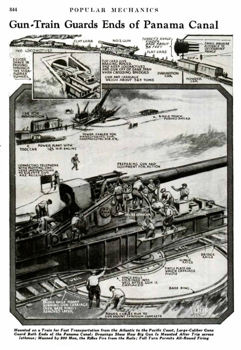 Two of these guns were stationed in Panama at for use at Fort Grant and Fort Randolph in the Panama Canal Zone, where they could be moved to either coast on the Panama Canal Railway. The article included detailed illustrations of the railway guns and their operations, describing the engineering feats achieved to safeguard this critical maritime passage.